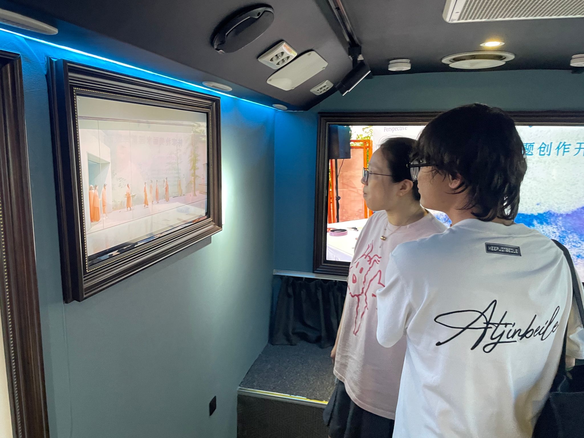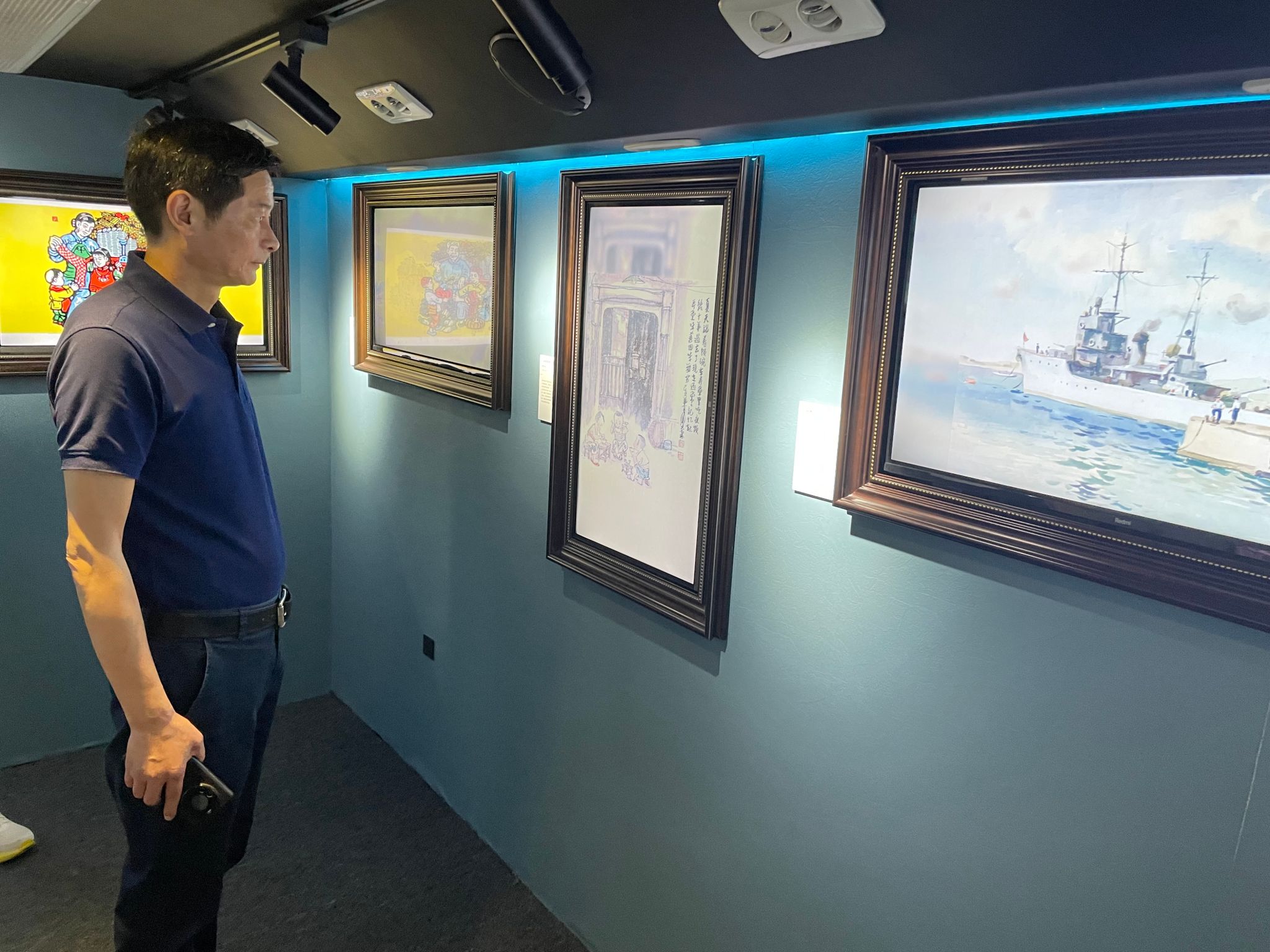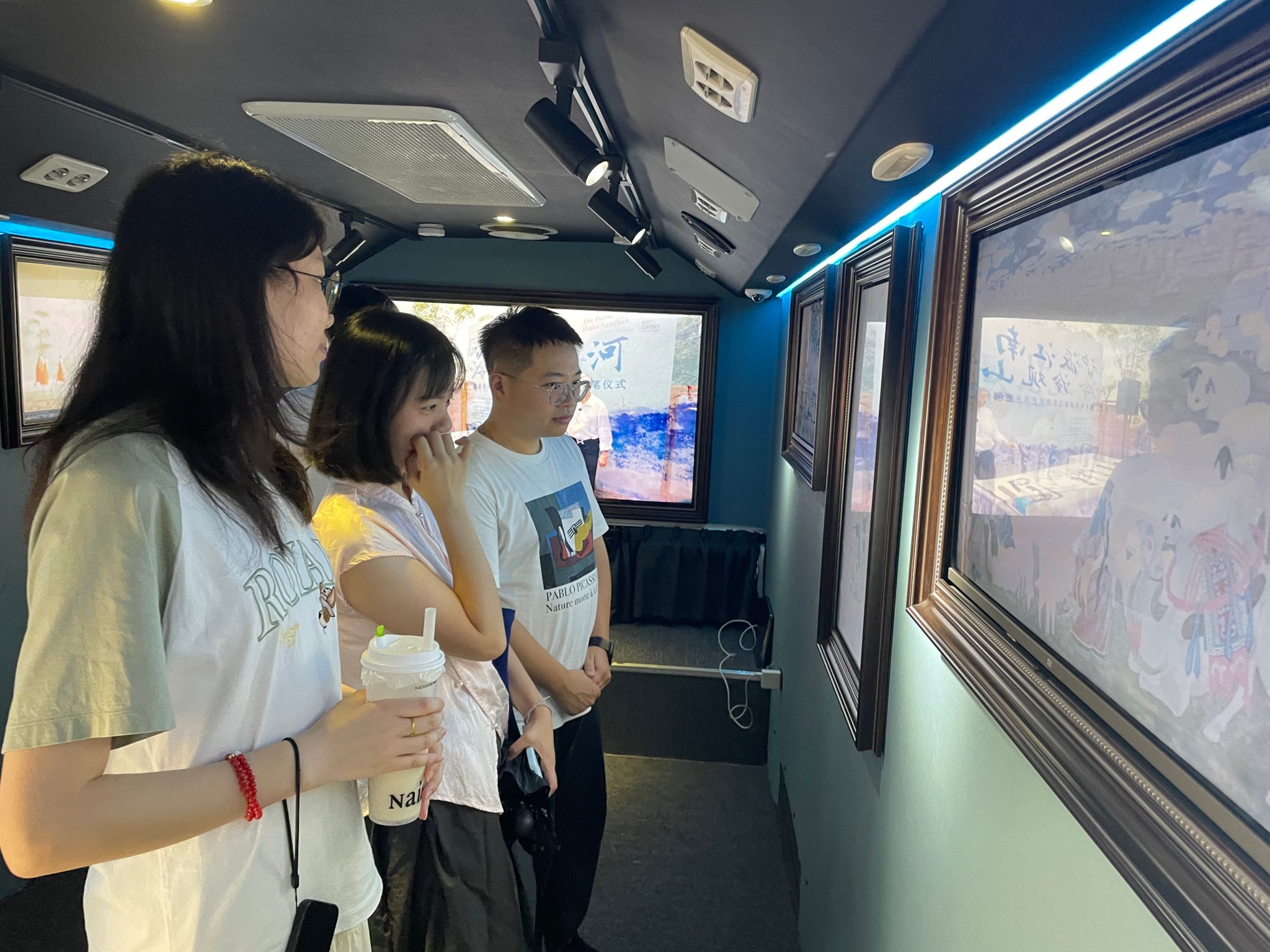 大巴上,16块高清电子屏循环展示着《丙安镇·四渡赤水》《丰衣足食图》《唱支山歌给党听》等数十幅百年经典画作,涵盖国画、版画、油画、新媒体艺术等多种形式。老师们驻足观赏,深深感受艺术与时代的紧密联结。